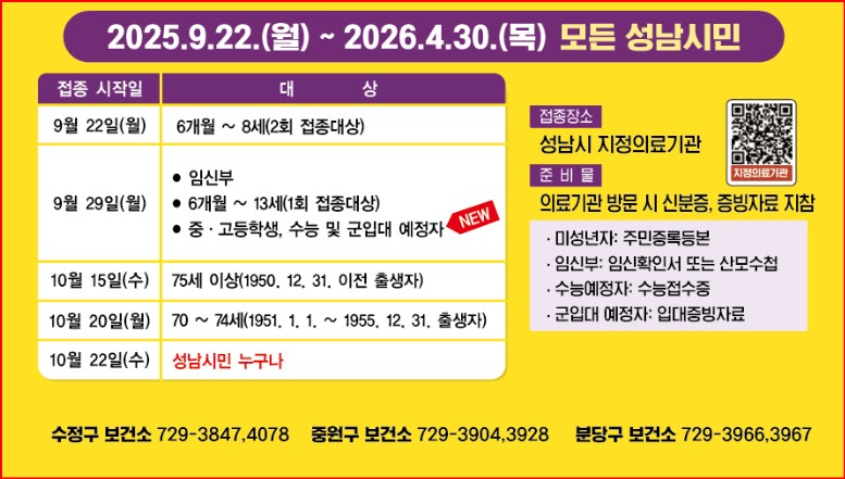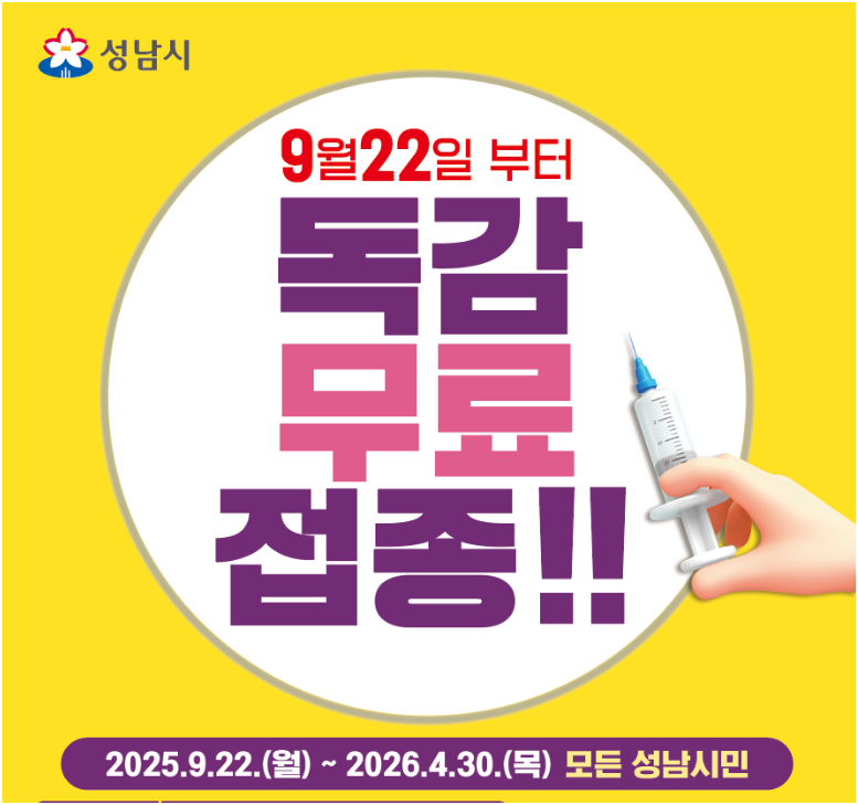 성남시는 올해(2025년)는 9월 22일 부터 성남시민 모두에게 독감 무료 접종을
