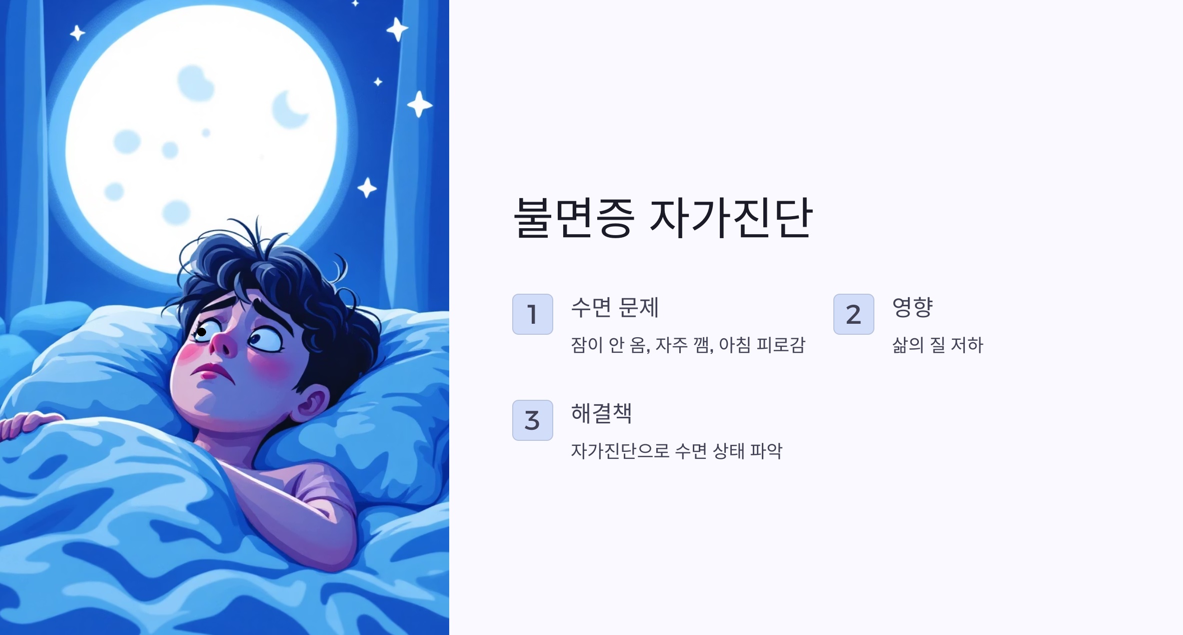 불면증은 제대로 관리하지 않으면 삶의 질을 크게 저하시킬 수 있습니다. 자가진단을 통해 수면 상태를 점검하고, 건강한 수면 습관을 유지하세요. 여러분이 더 나은 수면을 취하고, 활기찬 하루를 보낼 수 있기를 바랍니다. 🌙