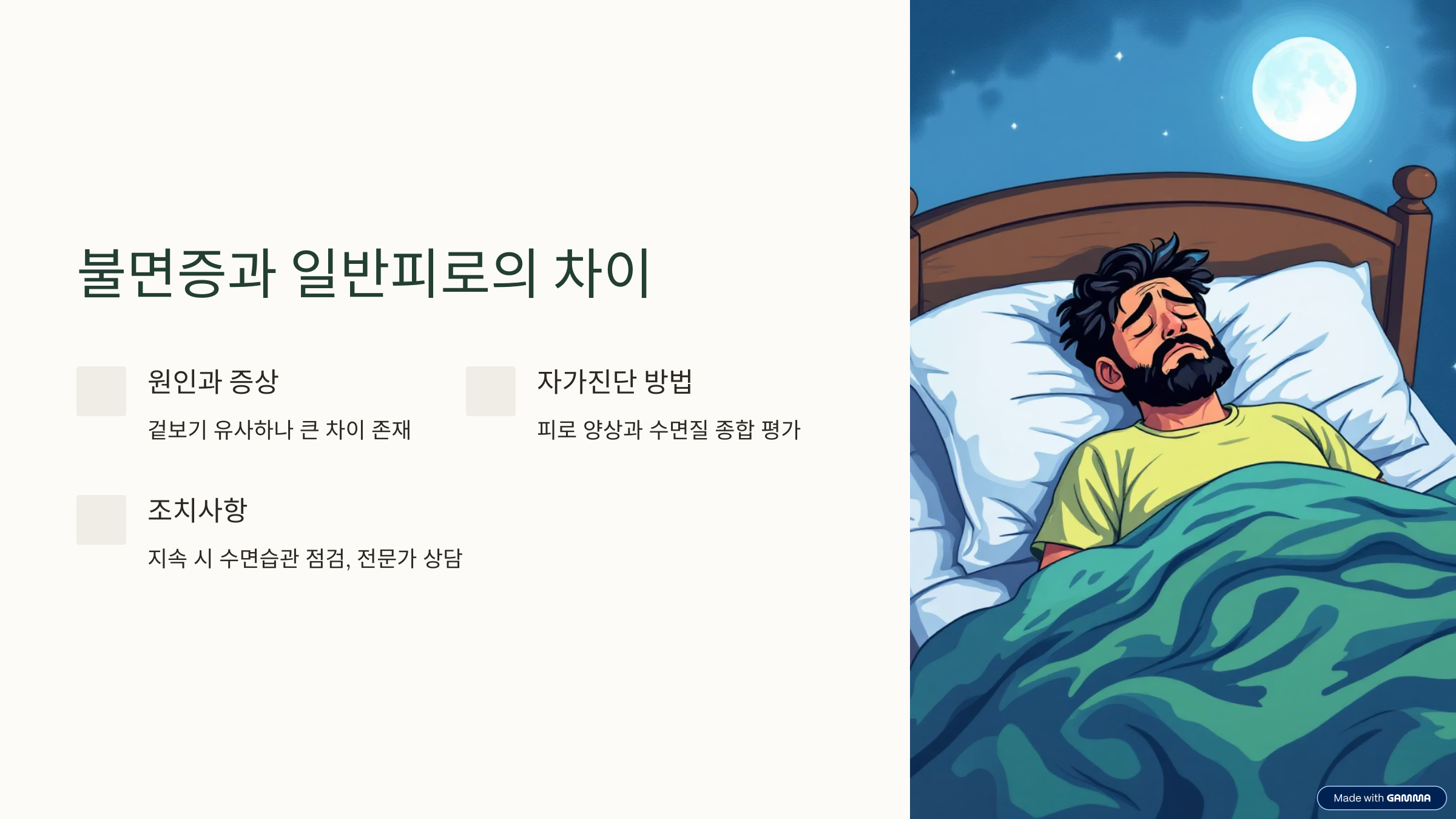 그냥 피곤한 걸까, 아니면 불면증일까? 많은 사람들이 수면 후에도 피로를 느끼며 헷갈려 합니다. 실제로 불면증과 일반적인 피로는 증상에서 비슷해 보이지만 원인과 해결 방법은 확연히 다릅니다. 이번 글에서는 자가진단, 피로도 수준, 수면질을 중심으로 두 상태의 차이를 명확히 비교 분석해보겠습니다.