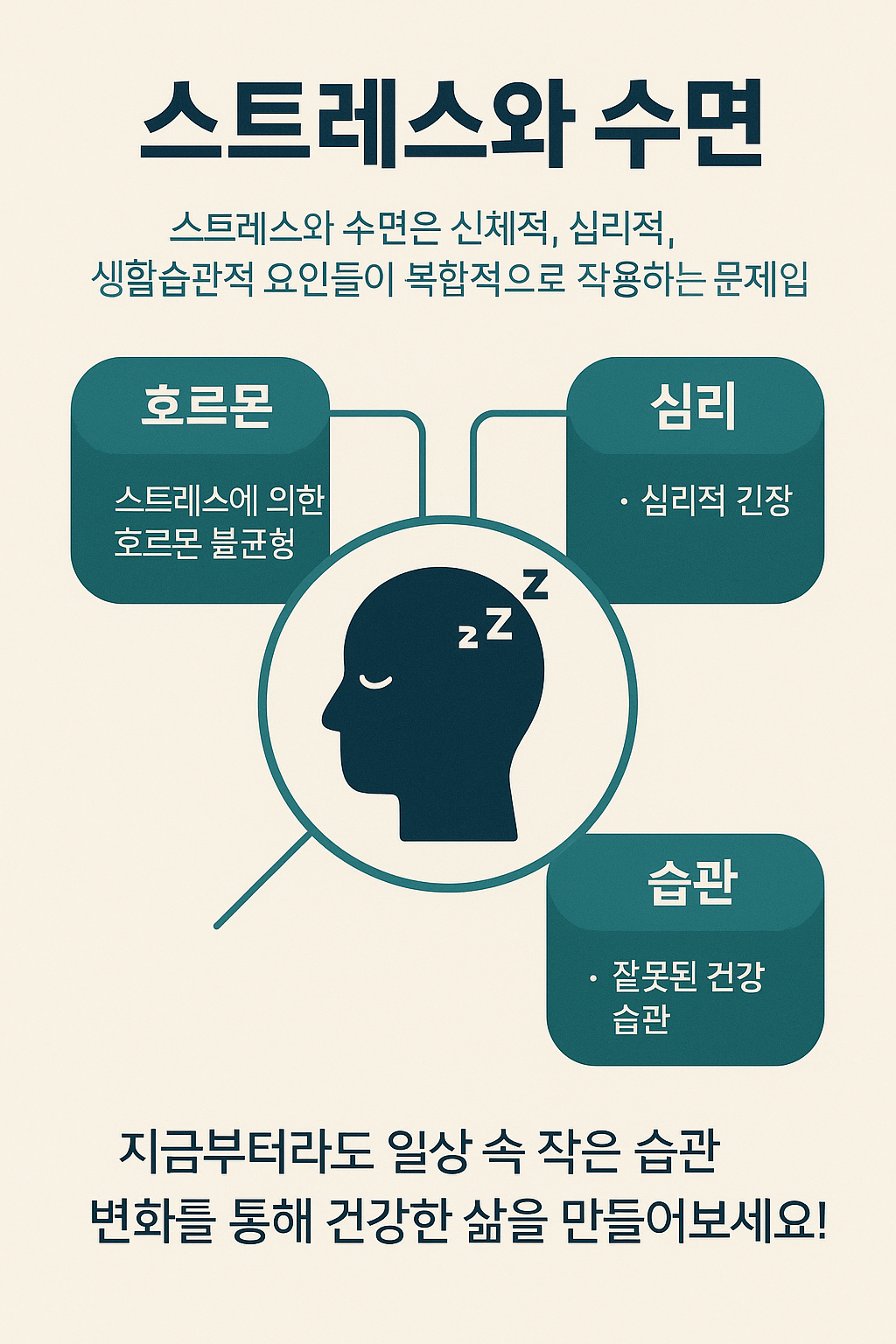 스트레스와 수면은 신체적, 심리적, 생활습관적 요인들이 복합적으로 작용하는 문제입니다. 스트레스에 의한 호르몬 불균형, 심리적 긴장, 잘못된 건강 습관은 모두 수면의 질을 떨어뜨릴 수 있습니다. 그러나 과학적 접근과 체계적인 관리 방법을 통해 스트레스와 수면 문제를 효과적으로 개선할 수 있습니다. 지금부터라도 일상 속 작은 습관 변화를 통해 건강한 삶을 만들어보세요!