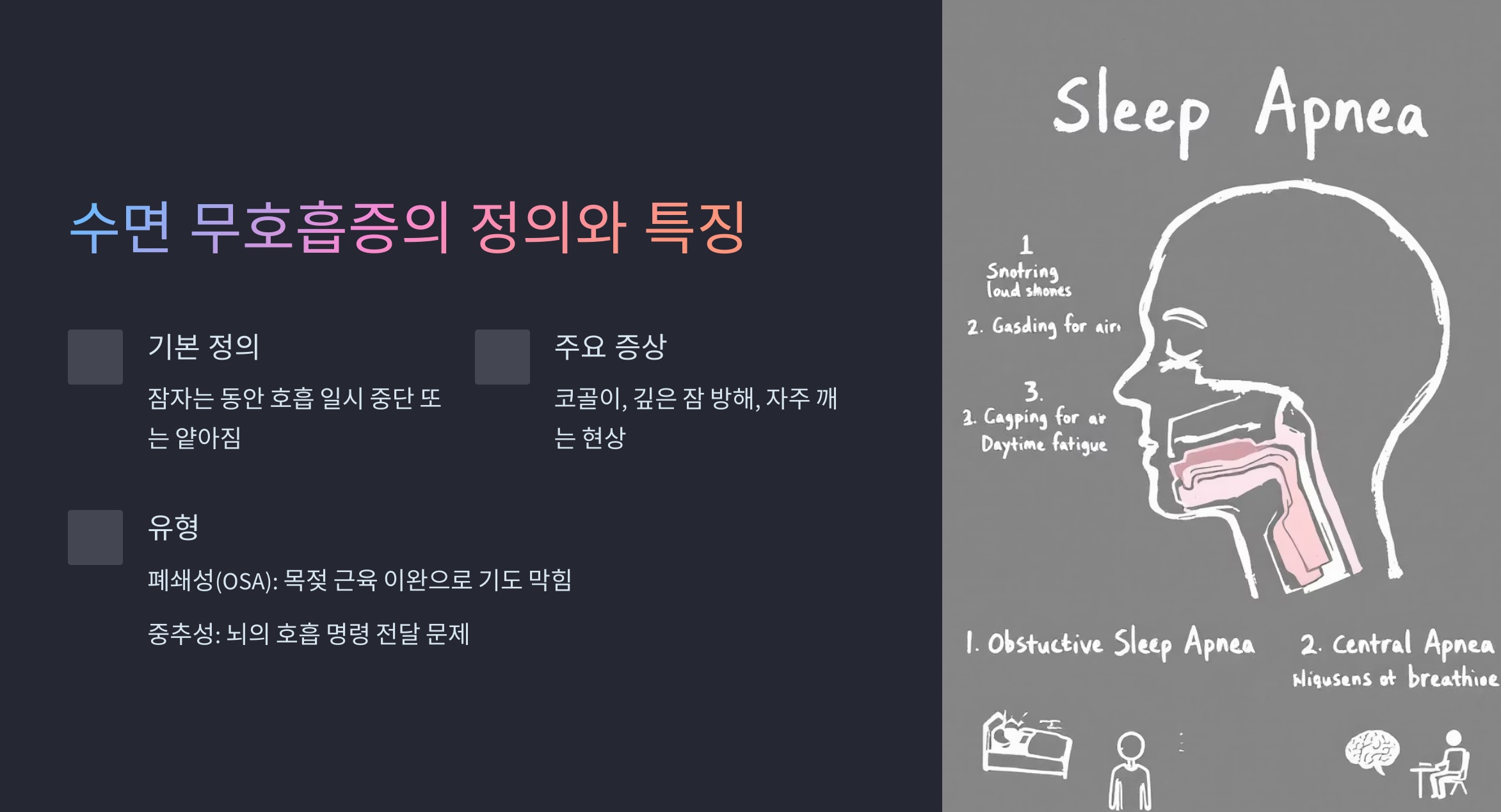 수면 무호흡증은 잠자는 동안 호흡이 일시적으로 멈추거나 얕아지는 현상을 말해요. 대부분 코골이와 함께 나타나며, 이로 인해 깊은 잠을 자지 못하고 자주 깨는 일이 반복돼요. 주요 유형은 폐쇄성 수면 무호흡증(OSA)으로, 목젖 주변의 근육이 이완되며 기도가 막히는 경우가 많습니다. 드물게는 뇌의 호흡 명령 전달 문제로 발생하는 중추성 수면 무호흡증도 있어요.
