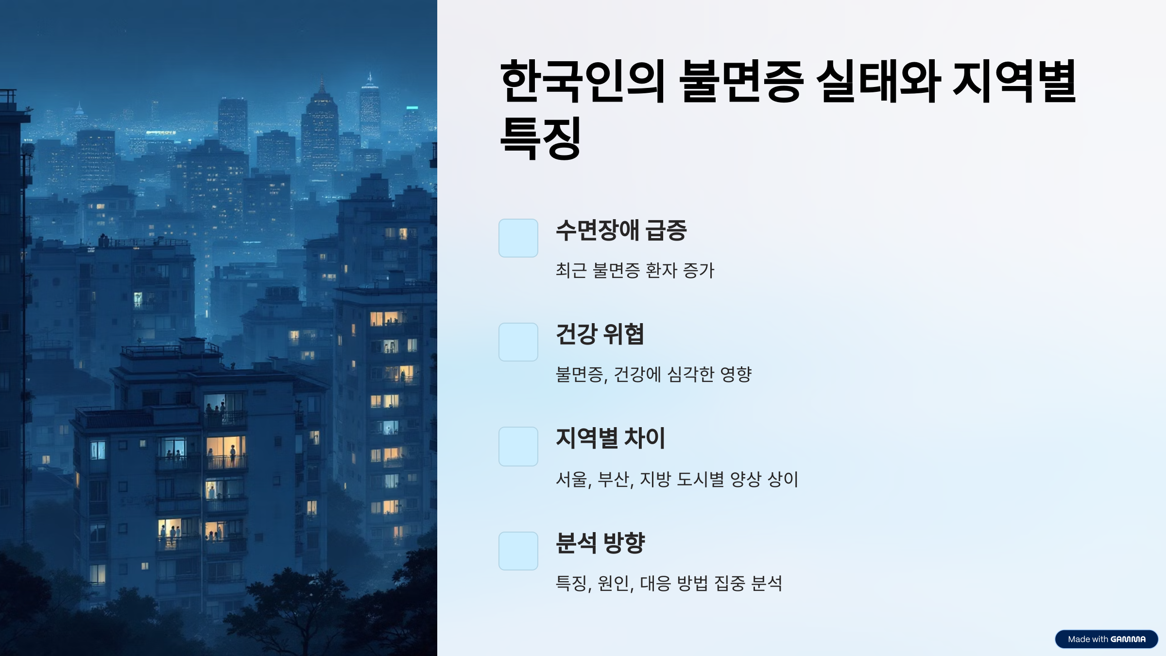 최근 수면장애를 호소하는 한국인이 급증하고 있습니다. 특히 불면증은 단순한 생활의 불편을 넘어서 건강을 위협하는 주요 요인으로 떠오르고 있습니다. 하지만 지역마다 그 양상은 조금씩 다르게 나타납니다. 이 글에서는 서울, 부산, 지방 도시를 중심으로 한국인의 불면증 실태를 살펴보고, 지역별 특징과 원인, 대응 방법까지 자세히 분석해보겠습니다.